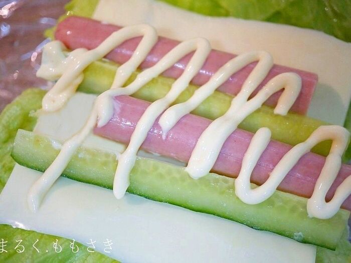 きゅうり2本、ウインナーを両端に合わせ置きマヨネーズを搾る。