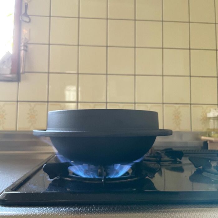 きれいに洗って布巾で鍋を拭いたらそのまま火にかけて...染み込んだ水気をさらに飛ばします。