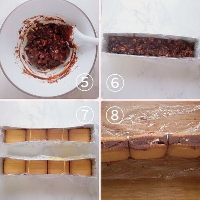 【7】平らにならしたら、ビスケットをのせて軽く上から押さえ、箱の真ん中を輪ゴムで2箇所とめて、冷蔵庫で2時間冷やしかためます。(写真⑦参照)