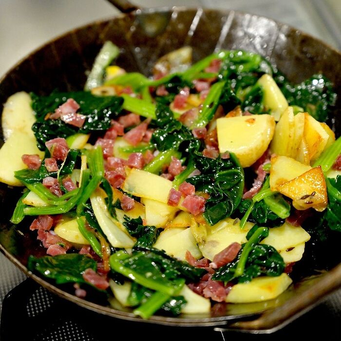 2:火が通ってきたら、ほうれん草とサラミを加え炒める。
