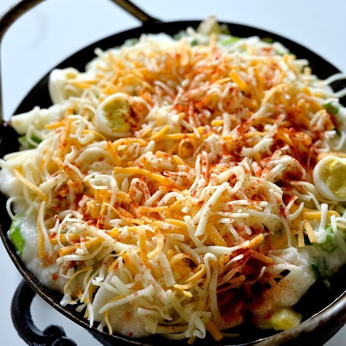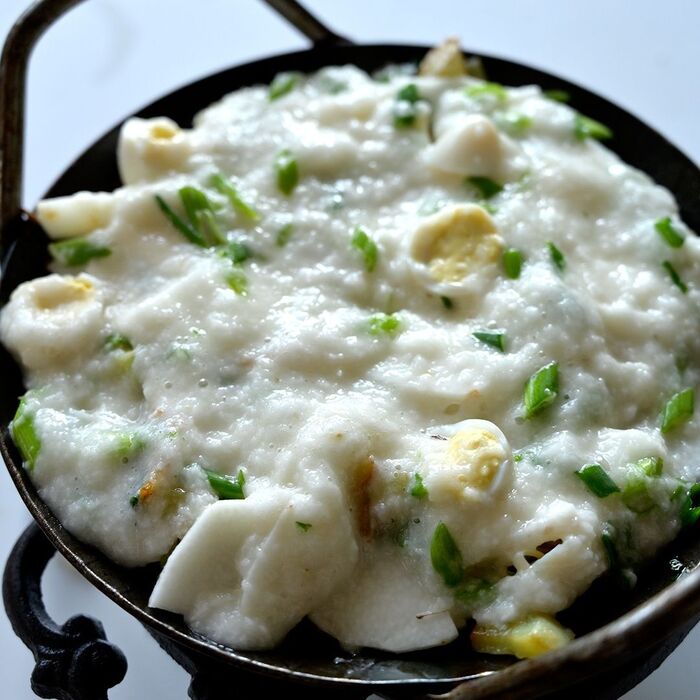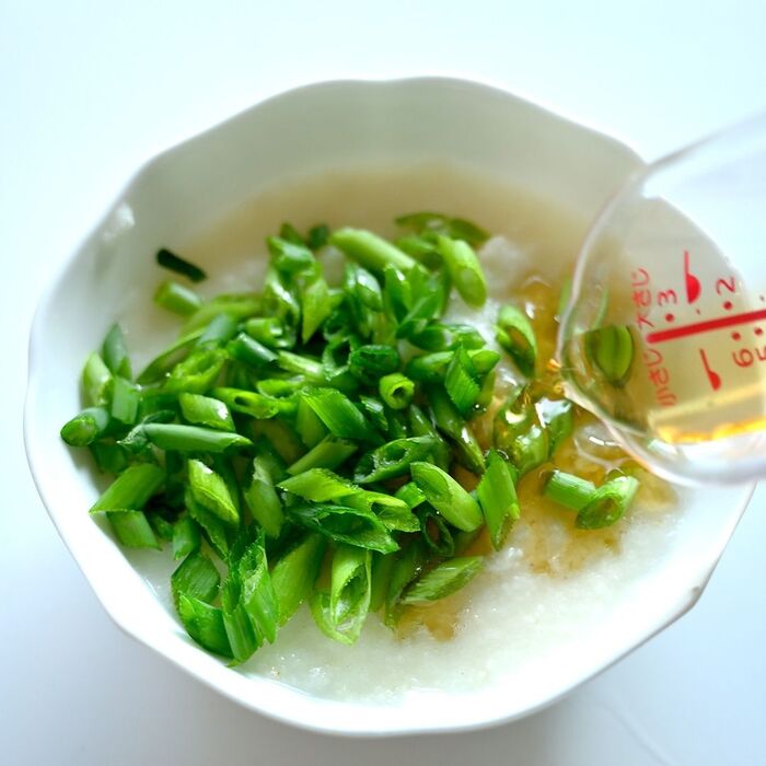 3:すりおろした長芋にこれ!うま!!つゆと小ねぎを加え混ぜ合わせる。