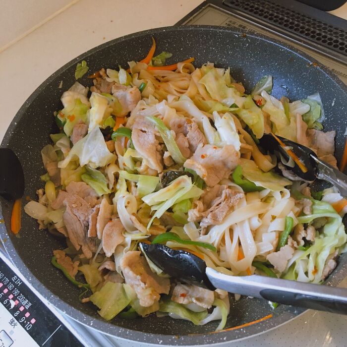 別ゆでしたビーフンを炒めます。