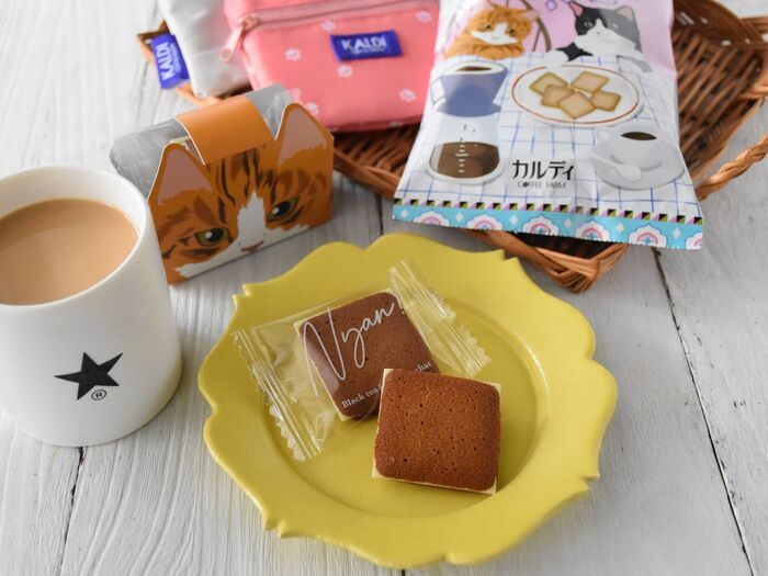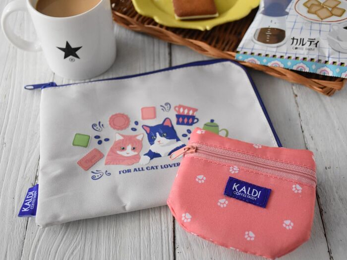中身は、猫のイラストが可愛いレギュラーコーヒー200gと、紅茶のラングドシャ3枚、猫のイラストが描かれたL字チャックポーチと猫型のミニポーチが入っています。