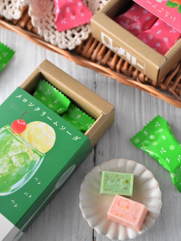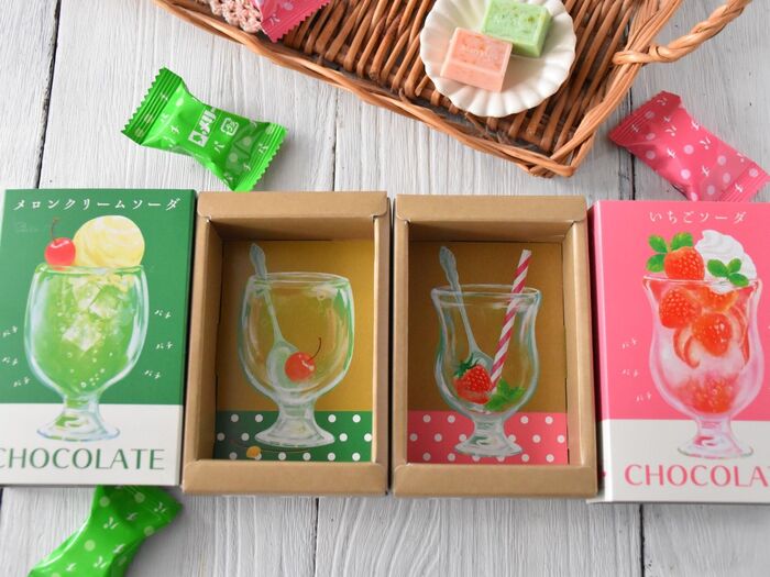 懐かしい味と新しい食感が一度に楽しめますよ(^^) クリームソーダ風味やいちごソーダ風味のチョコレートは、子どもが喜びそうな味わいです。