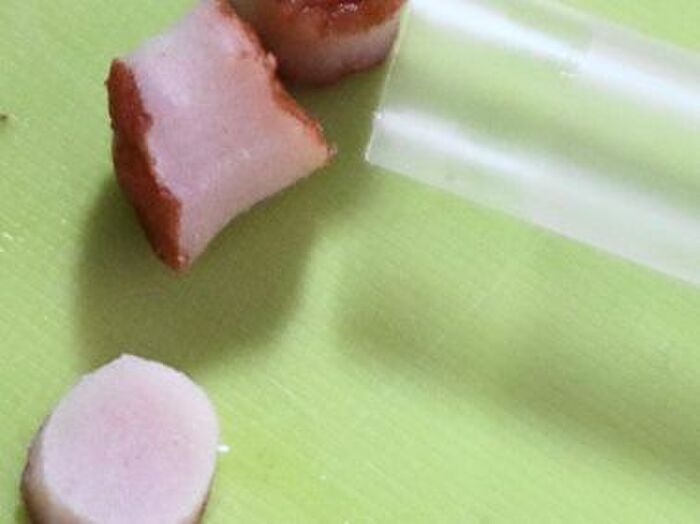 カニカマの赤い部分を剥がし、5㎜程度の幅に割いて貼ります。薄くマヨネーズを塗って貼り、端は乾燥スパゲッティで刺して固定すると◎。