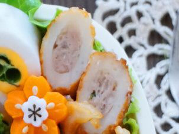 はんぺんとチーズのネギ巻きで使ったはんぺんの端でお花のデコ食材に。
