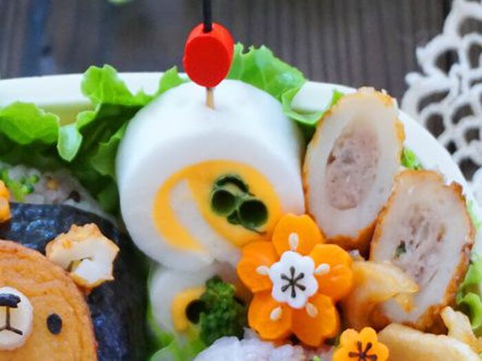 さつま揚げの色と形は動物キャラを作るのに便利。ご飯の上に乗せて作ってもいいですよね。