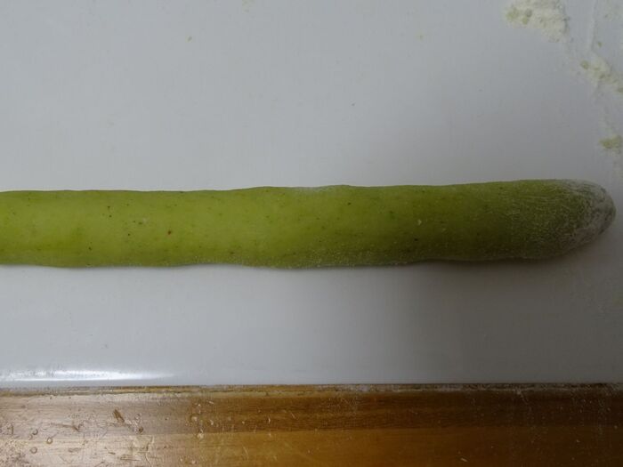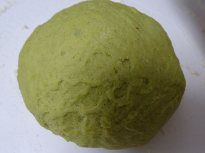 強力粉、ジェノベーゼ風ピュレ、卵、海老塩、を加えて生地を作る。
