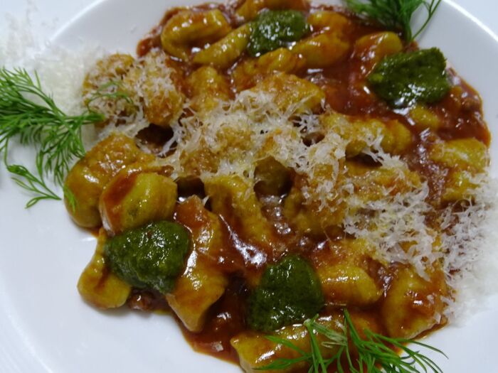ボロネーゼソースと絡めて、パルミジャーノ、ジェノベーゼソースを散らす。