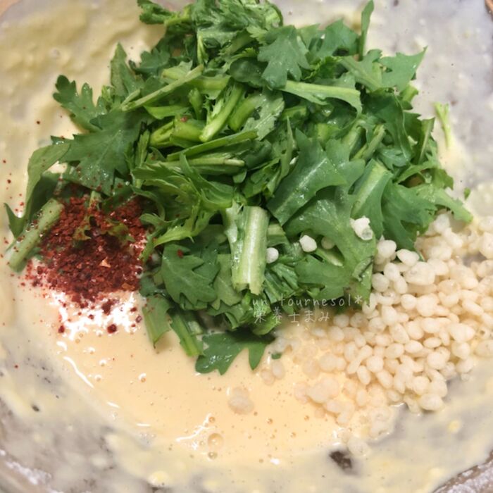 ☆をよく混ぜ合わせてから、春菊と揚げ玉・七味を入れて混ぜ合わせ、牡蠣を入れて優しく混ぜ合わせる。