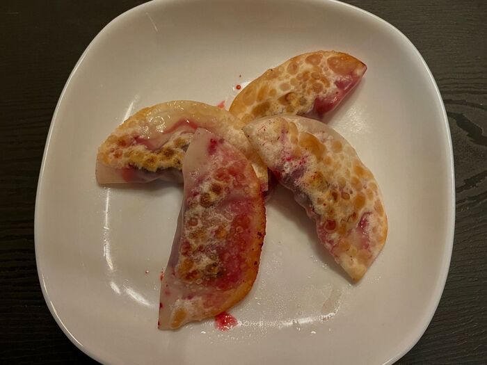 餃子の皮にブルーベリージャムをスプーンでのせ、周りに水をつけて半分に閉じます。