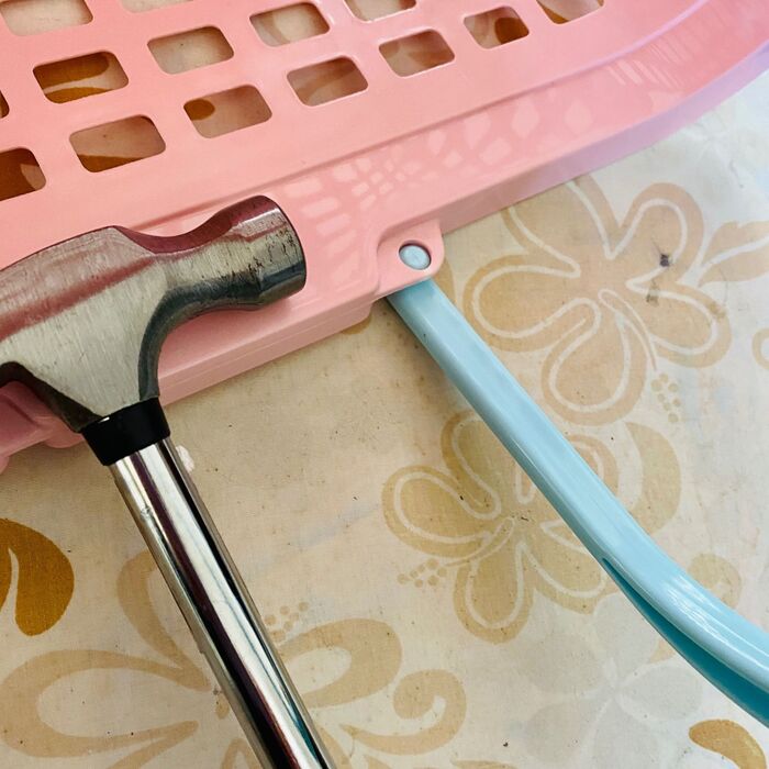 このまま、取っ手の差し込んだあたりをトンカチで叩きます。