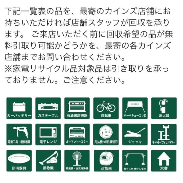 カインズホームでは、バーベキューコンロ、キャットインテリアタワーも無料で回収してくれます。