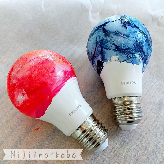 マニキュアでマーブリングを施した電球はこんな感じになります。↑