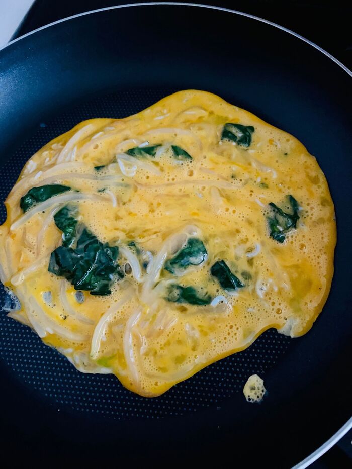 ⑤ボウルに朝食で残しておいたお浸し(もやし、雪菜、しらす)と卵を混ぜ、予め熱しておいたフライパンで厚焼き卵を作ります。