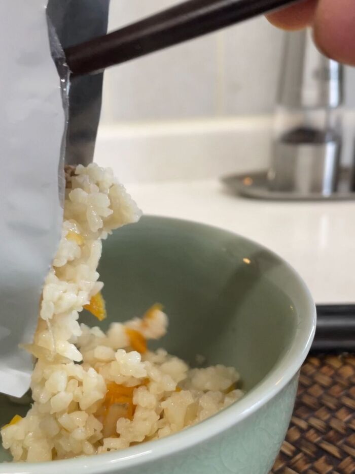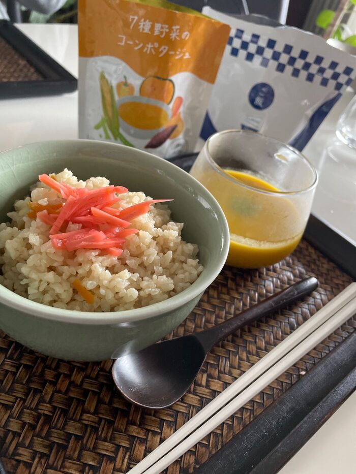 【鶏ごぼうご飯】(紅ショウガは自宅にあったもの)