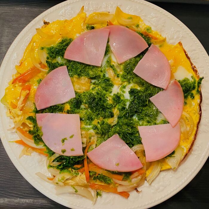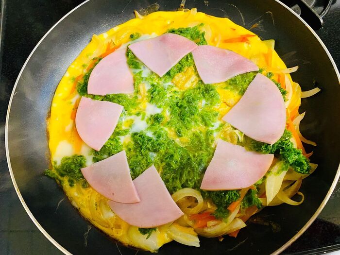 そこに、ボールに卵、牛乳を入れて塩胡椒し、よく混ぜたものを流します。