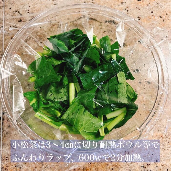小松菜は3~4㎝に切って耐熱ボウル等でふんわりラップ、600wで2分加熱する。