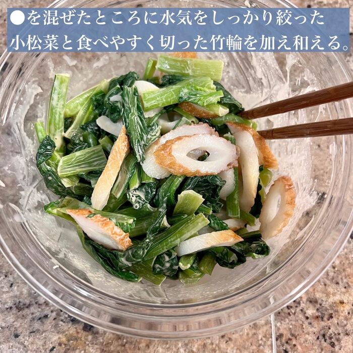 ●をまぜたところに水気をしっかり絞った小松菜と食べやすく切った竹輪を加え和える。