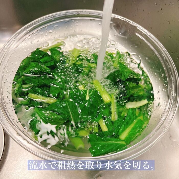小松菜は加熱後水道水で粗熱を取りひと握りずつ両手で優しく、でもしっかりと圧をかけ水気を絞ります。