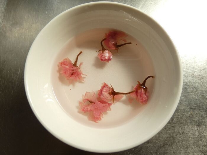 桜の塩漬けは水に5分くらいつけて塩抜きし、キッチンペーパーでしっかり水気を切っておきます。