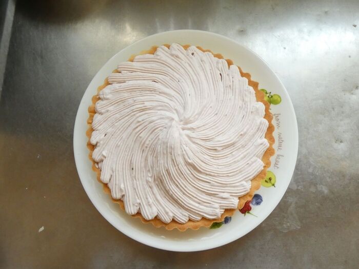 桜クリームをしぼり袋に入れて、生クリームの上に絞ります。
