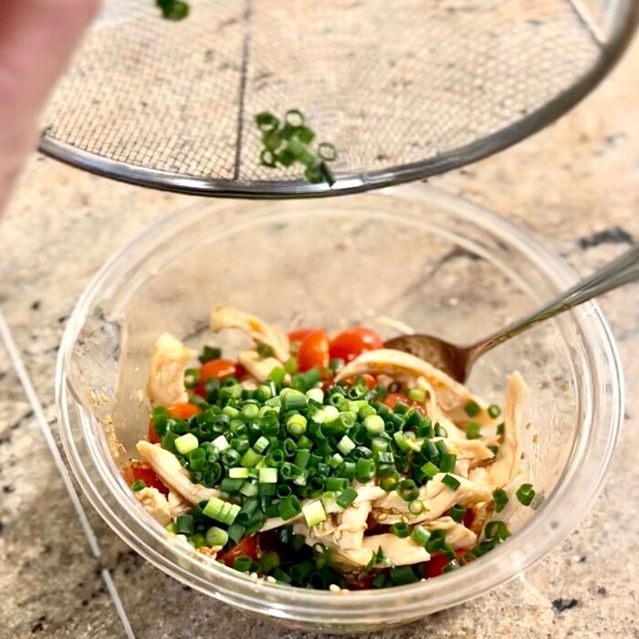 ペーパーで水気をしっかりとったチキンを裂きながら加えたらネギも加え混ぜる。