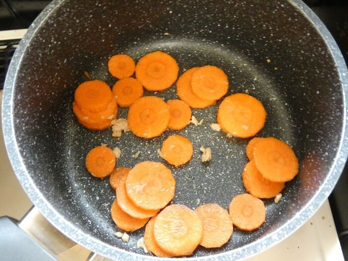 鍋にツナ缶のオイルと人参を入れて炒めます。
