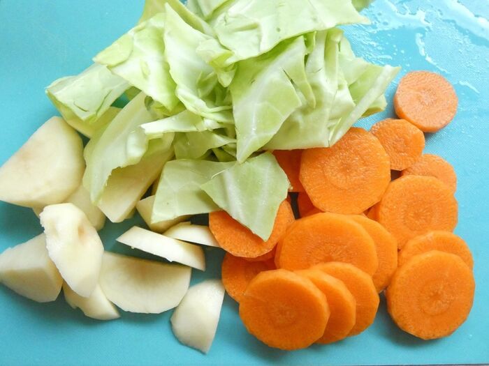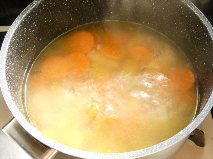 じゃが芋は1㎝の厚さの半月切りにし、人参は5㎜幅の輪切りにします。