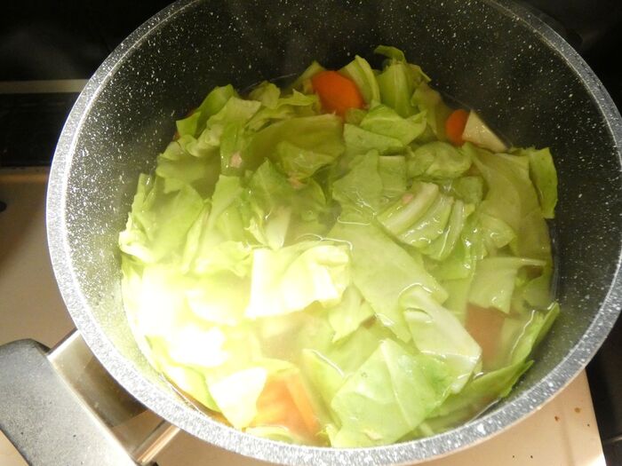 じゃが芋が柔らかくなったらキャベツを入れ、キャベツがしんなりしたら味噌を溶かして完成♪