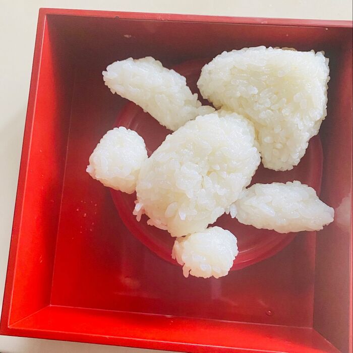 ご飯に塩をつけて、スヌーピーの顔、腹、腕、足を立体的に握っていきます。