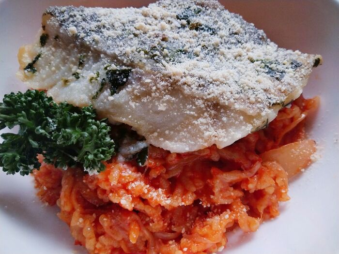 鱈は癖もなく食べやすい淡白な味。トマトリゾットとの組み合わせもバッチリで