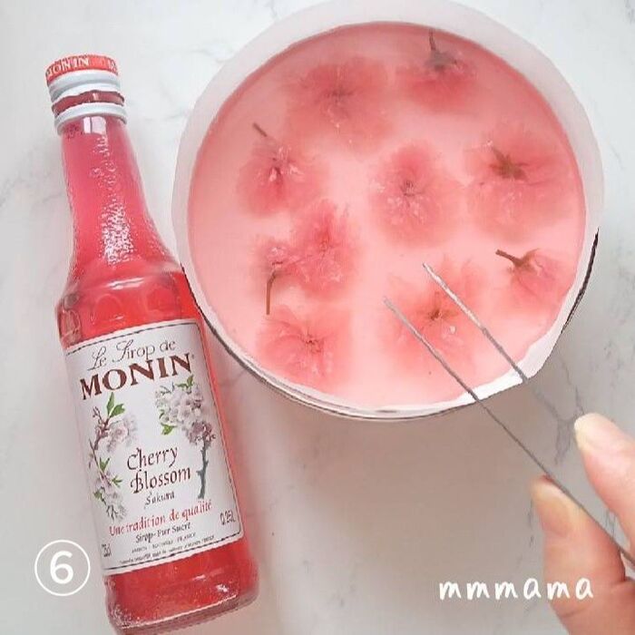 【13】鍋が触れるくらいに冷めたら、【11】に優しく流し入れて、桜をピンセットや箸でつまみ、左右にふりふりさせて花びらをひらいてください。(写真⑥参照)