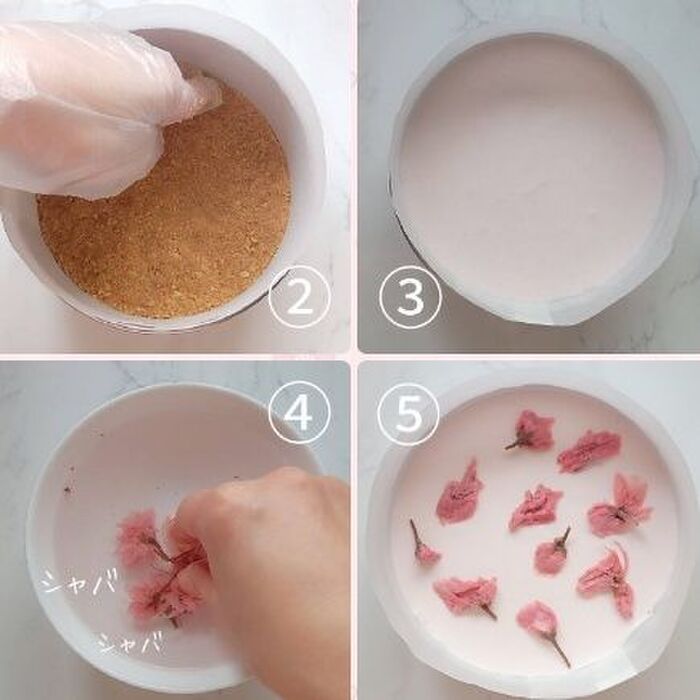 【9】冷蔵庫で冷やしていた型を取りだし、桜レアチーズの生地を流し入れ、冷蔵庫で30〜40分冷やし固めます。(写真③参照)