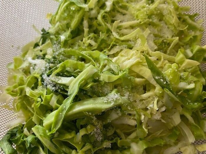 春キャベツは千切りにして塩をふりもんで水気をしっかりきる