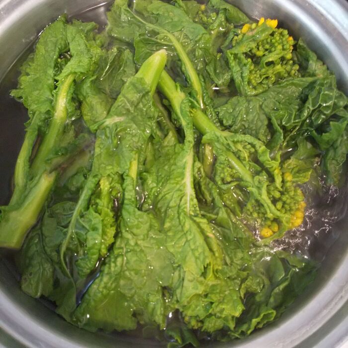 ⑤菜の花を沸騰したお湯(分量外)でさっと茹でる。冷まして水気をしぼり食べやすい大きさに切る。
