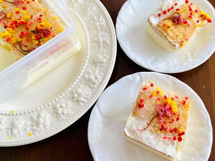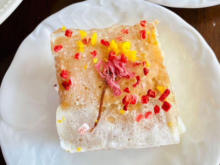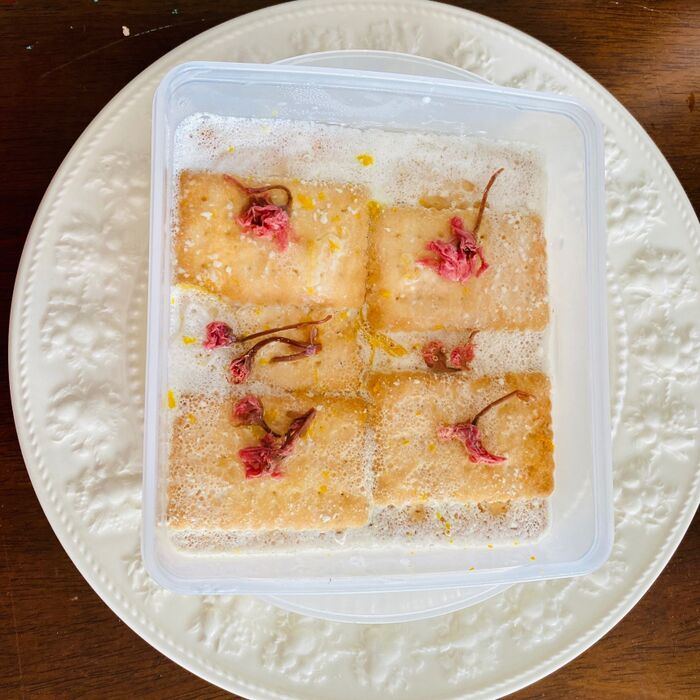 ③桜の花の塩漬けを、塩抜きして乗せます。