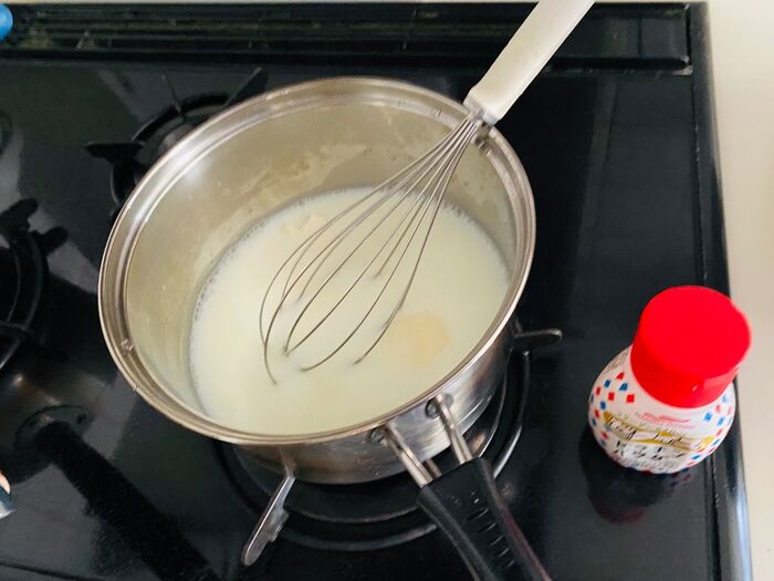 ①小鍋にゼラチン、牛乳、クリームチーズをいれ、煮溶かします。