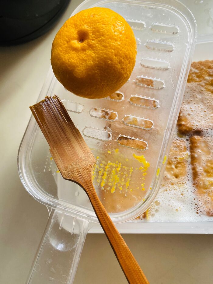 ⑤柚子のすりおろしを乗せ、ドライフルーツイチゴをパラパラかけます。
