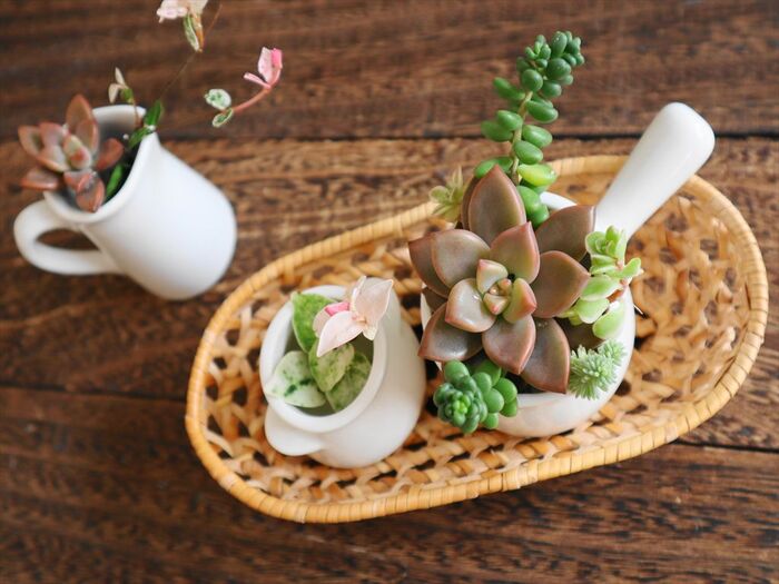 間延びした多肉植物を剪定して、切り口を乾かしている間を楽しむのにも♪ ぽいぽいっと挿しこんでおけば、そのうち発根してくれます。季節にもよりますが数週間はこのまま楽しめます。水の管理に気をつければ鉢植えとして植えることも可能。