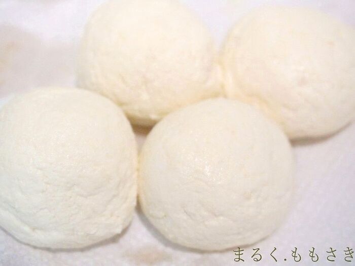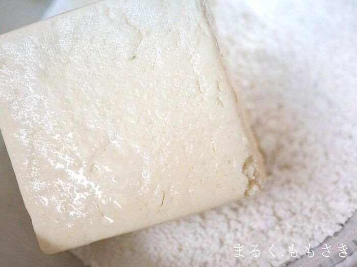 ①白玉粉のボウルに豆腐を入れ手で捏ね1つにまとめる。