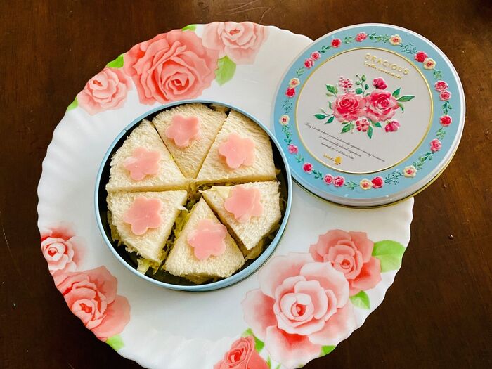 ロースハムを梅の型抜きで抜いて上に飾ります。