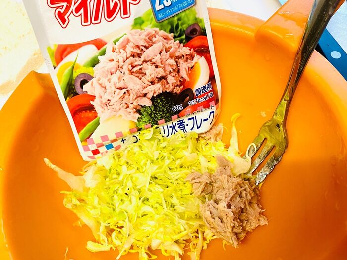 そこに、油を切ったツナを入れ、コショウ、マヨネーズで味を整えます。
