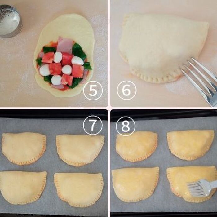 【5】広げた生地の手前半分の端をあけ、ピザソースを大さじ1/2ずつぬり、ベーコン・バジル・トマト・モッツァレラチーズをのせます。(写真⑤参照)