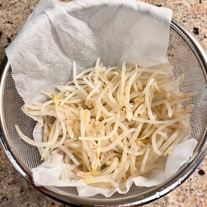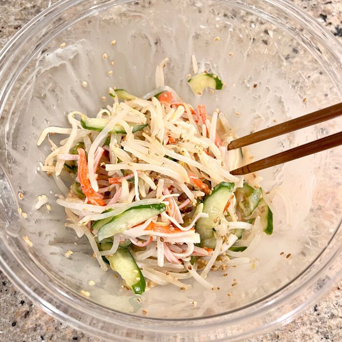 もやしは水洗いし耐熱ボウルに入れふんわりラップ、600wで2分加熱。