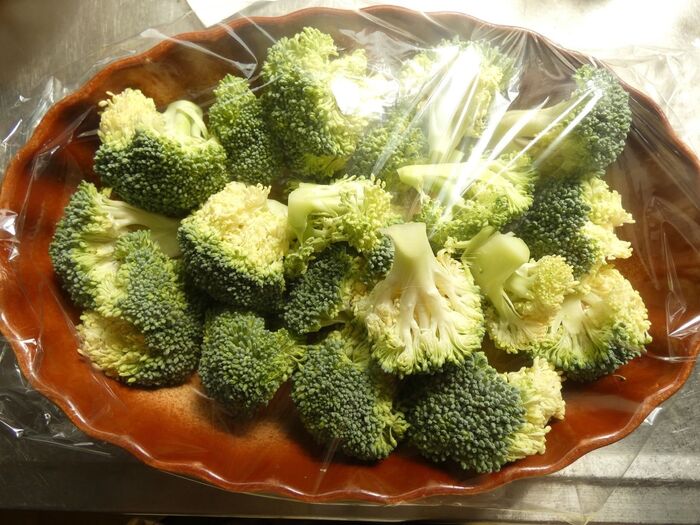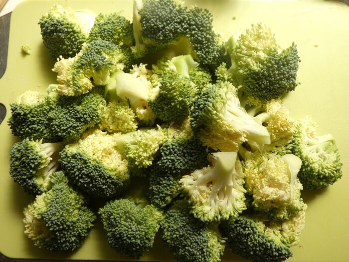 ブロッコリーは子房に分けます。茎は厚めに皮をむき、乱切りにします。