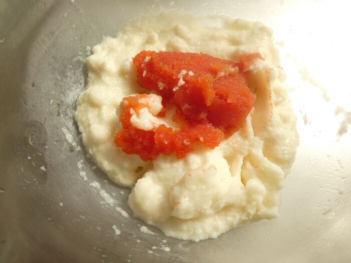明太子をしっかりほぐすと、混ぜ合わせやすいです。