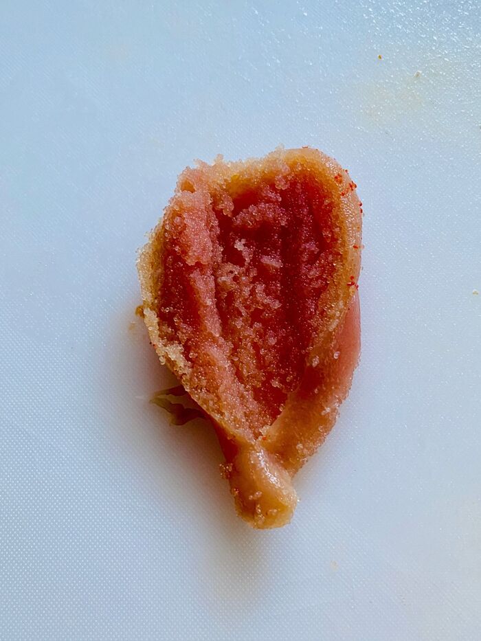 明太子は、薄皮に切れ目を入れて包丁の背で掻き出すように掬います。