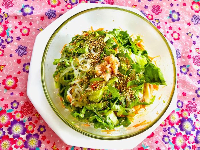ボウルにしらたき、人参のせん切り、ロースハムのせん切り、竹輪のせん切り、レタスを入れます。ごま油、鰹出汁、明太子を入れよく和えます。