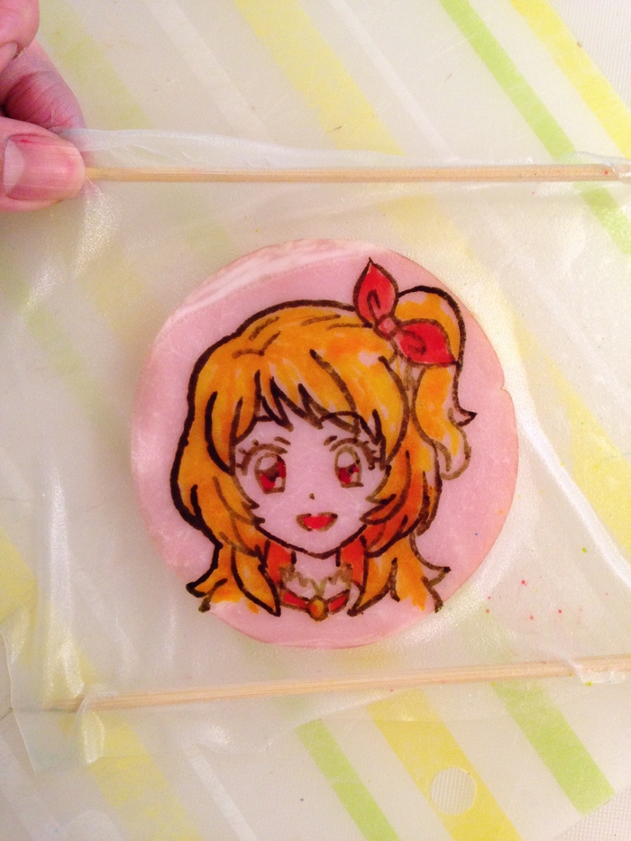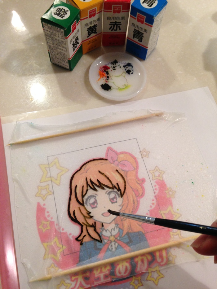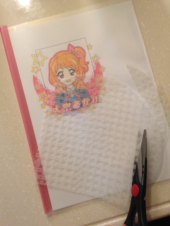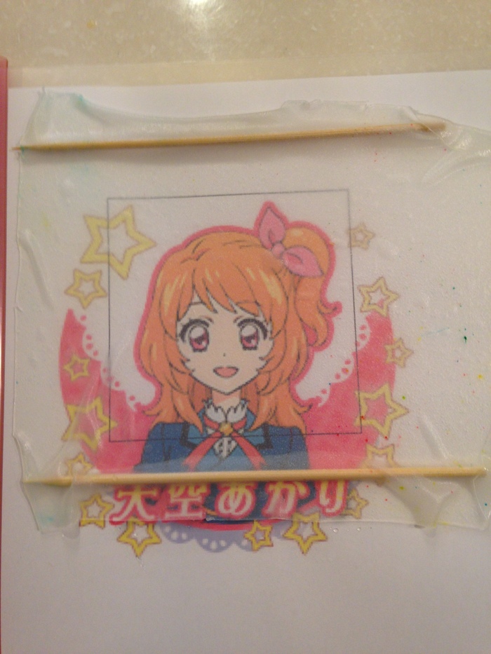 その上に、お湯に浸して柔らかくしたライスペーパーを、イラスト部分に空気が入らないように置きます。